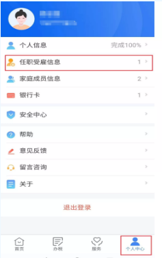 (1)登录个人所得税APP,打开【个人中心】找到“任职收入信息”。